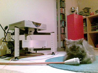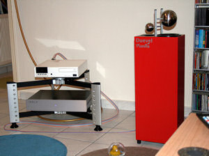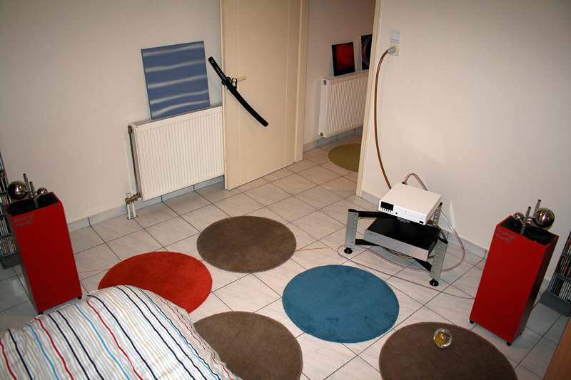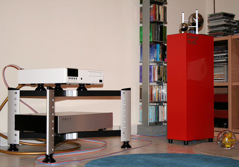 System is: Linn Classic K on Aktyna A.r.i.s. isolation feet on a Finite Elemente Spider rack with Aktyna feet attached to it, with mains fed from an Isol-8 Minisub2 using two Van den Hul Mainsstream mains cables, Duevel Planets with Eichmann Toppers attached to their back side, and speaker cable the new DNM Stereo Precision Solid Core, which passes through 3 A.R.T. (ferrite) Q-rings.