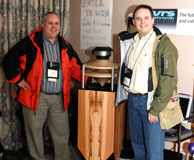 SoundStagers John Crossett (left) and Jason Thorpe pose with the top-of-the-line Duevel Jupiter loudspeaker, which looks and sounds distinctive. It's at the top of our "for later listening" list.