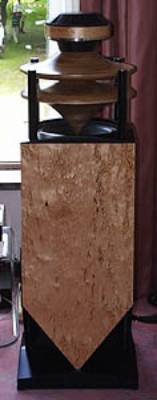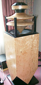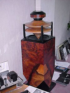 This interesting piece of furniture is the Duevel Jupiter. It not only looks good, but should be of special interest to single-ended-triode fans or others of a similar persuasion. It is a two-way system of high efficiency, marrying horn and bass-reflex technology with an ingenious twist. By using the reflectors/horns as seen in the picture, the speaker's maker, CD Koncert Möbel, avoids the narrow dispersion characteristics of the rather large bass driver, which is used into the midrange. The bass unit points upwards, is reflex loaded, and has the midrange covered by the unit above and dispersed via the cone mounted over the driver. This cone forms an integral part of the horn and is used with the compression driver mounted above. All in all, this is a very clever design that gives a much larger than normal sweet spot (you would be tempted to say none) than most other speakers and especially the high-efficiency ones. They are not only beautiful, but they produced excellent sound together with Klimo valve amps.