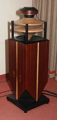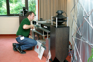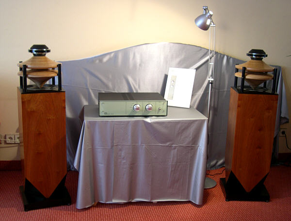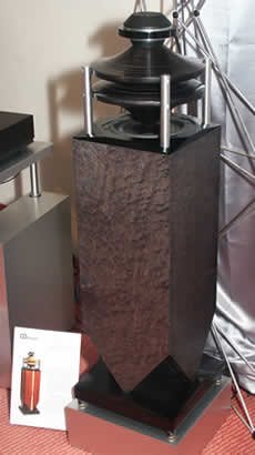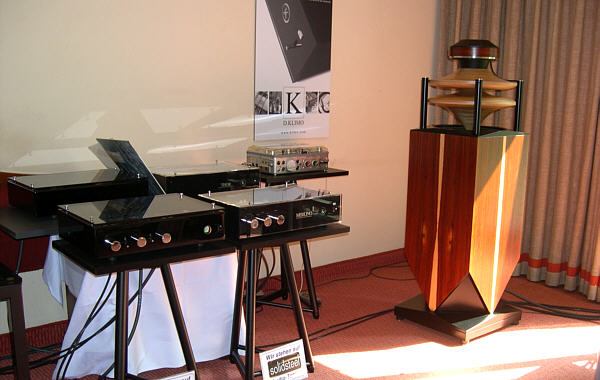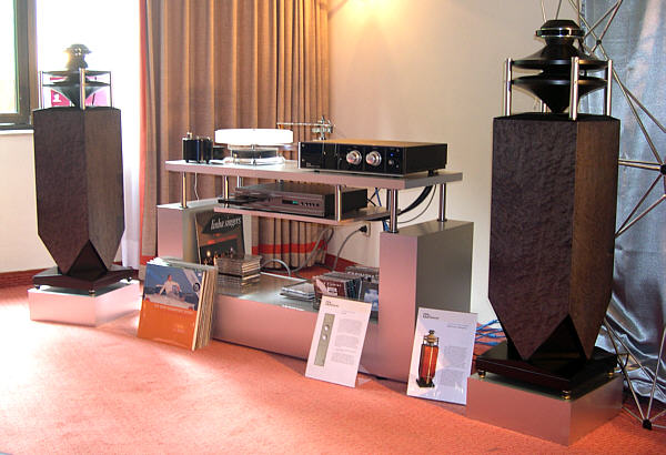 Capitalizing on an unconventional design, Germany's Duevel showcased its Bella Luna Diamante loudspeakers to great effect. The 360-degree radiation pattern produced by each speaker provided remarkable sound both in the sweet spot and waaay off axis -- not an easy feat. The system was driven by the company's brand-new solid-state Shuttle integrated amplifier and a modified, proprietary CD player. A company spokesman stated that oftentimes customers use Duevel speakers with tube amplification, but equal success with solid-state amplifiers could be obtained. This was a feature the company wanted to highlight throughout the show, and they accomplished their mission with the Shuttle.