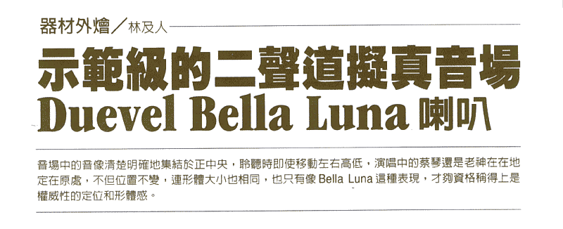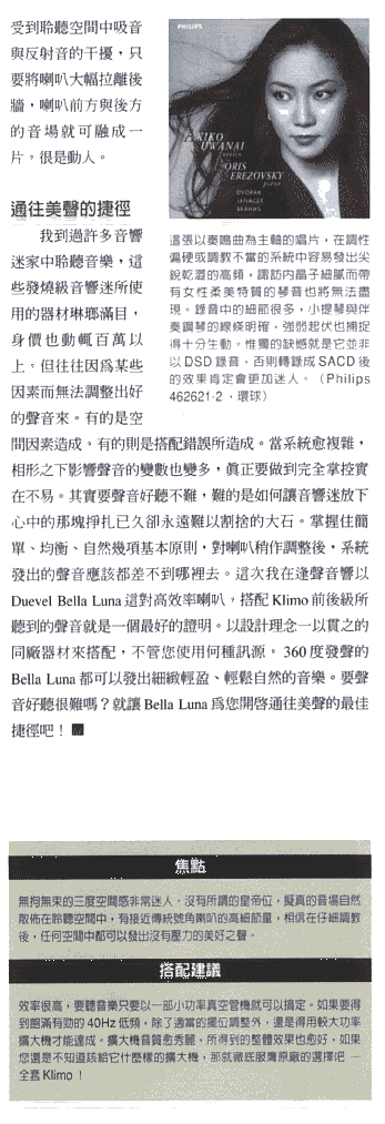 I have ever visited many stereophiles. They have various equipments, and those equipments are often very expensive. However, most of them are not properly installed and/or adjusted and thus don't reproduce good sound. When the audio system gets more and more complicated, there are more and more variables that can affect the sound. It is really difficult to get control over all those variables. Actually, it is not difficult to get good sound. What is difficult is to have stereophiles let go their prejudices. Just accept a few principles: simple, balanced and natural. This is well proven in this listening test. Duevel Bella Luna matched up with Klimo amplifiers gives such delicate, graceful, relaxing and natural sound. Is it so difficult to get beautiful sound? Let Bella Luna show you the shortcut o it!