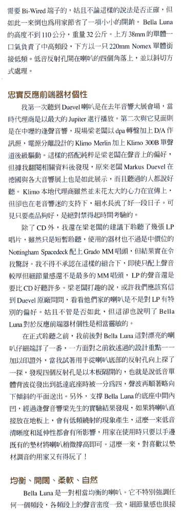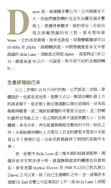 The first time I heard the sound of Duevel loudspeakers was last year, at the annual high-end audio exhibition. At that time the distributor was demonstrating with the largest model, Jupiter. The second time I met Duevel speakers was at the Fong-sheng Audio in Chung-li. The owner, Mr. Liang used dpa transport and a D/A converter as the signal source, and Klimo Merlin and Klimo 300B mono blocks were the amplifiers. The combination was Mr. Liang's personal preference, but after I did some research, I found that Mr. Markus Duevel also uses this set of equipments for demonstration at the many large audio exhibitions in Germany. Although Klimo's distributor in Taiwan doesn't put much effort in advertising, Klimo still has lived for a long period of time. It is thus evident that a product surely won't fade out with time as long as it is good enough.