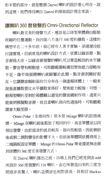 Omni-Polar was originally the registered trademark of Mirage Loudspeakers. Mirage placed the same driving units both at the front and at the back of loudspeaker cabinets and fed them with in-phase signals. After all, Mirage's Omni-polar still cannot achieve a 360-degree ideal spherical sound reproduction. Before Duevel's loudspeakers enter the market, we've seen a 360-degree sound reproduction loudspeaker - mbl 101. It can create such an astonishing three-dimensional sound stage, and thus it is also very expensive. I believe that Markus Duevel is absolutely a genius; I don't know where his inspiration came from, but de did think out this cost-effective omnidirectional design. The disc-shaped device extends both high and low frequency energy evenly towards every direction and eliminates the point directional problem of all driving units. Duevel names the device "Omni-Directional Reflector."
