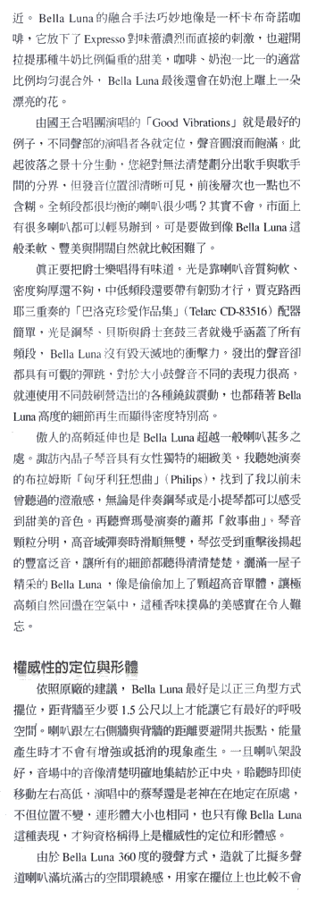 The "Good Vibrations" of King's Singers is a good example. Singers of different parts are perfectly positioned, and the voices are rich and mellow. The notes are vividly expressed one after another. The arrangement is so clear as if you can see it right in front of your eyes. There are quite many loudspeakers that are balanced in all frequency bands, but few are as soft, smooth, wide and natural as Bella Luna.